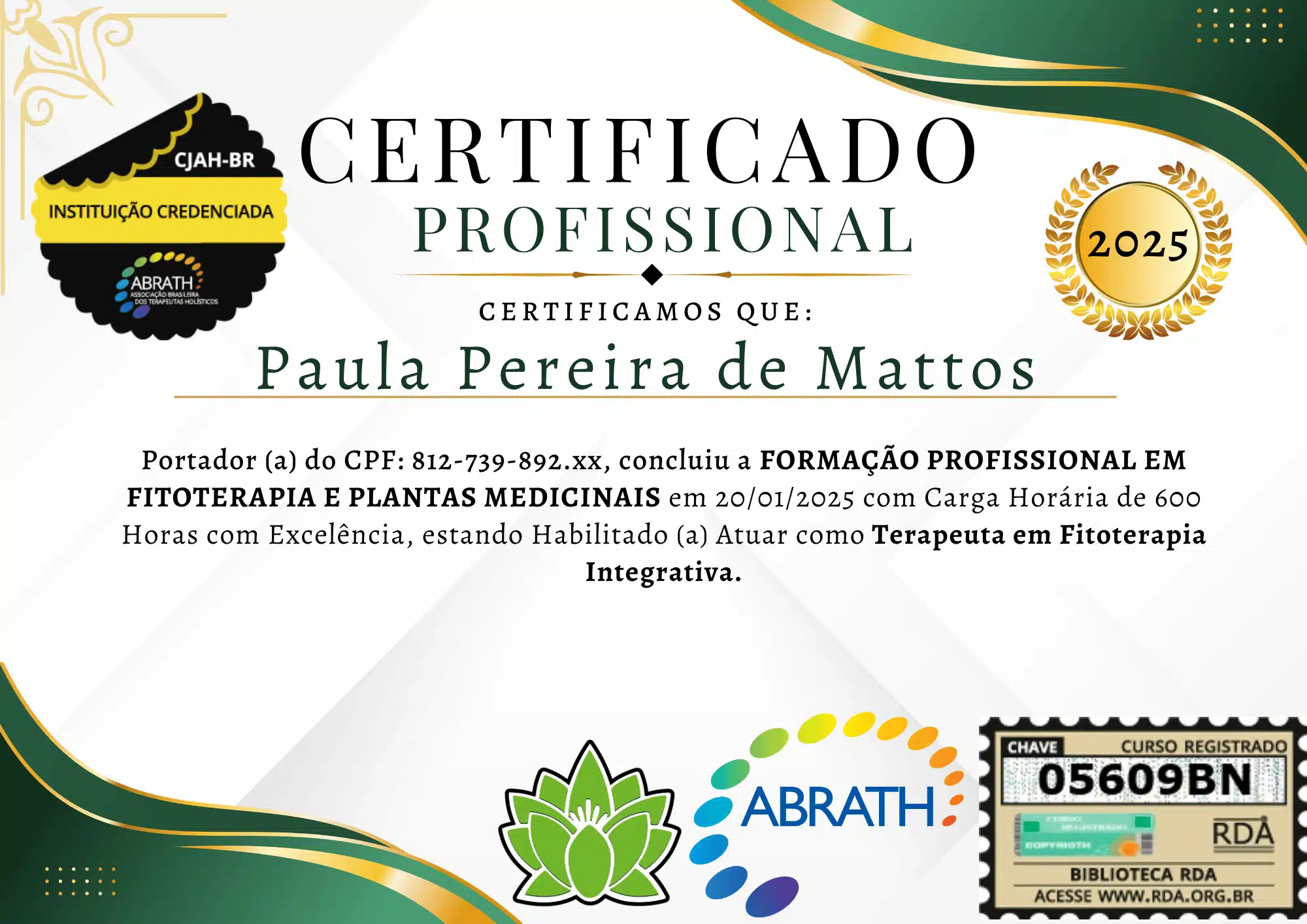 Sim! O nosso certificado é reconhecido pela ABRATH (Associação Brasileira dos Terapeutas Holísticos) permitindo que você atue legalmente na Profissão, realizando atendimentos e indicando os remédios Fitoterapicos. O Aluno certificado poderá retirar sua carteira Profissional (CRT – Conselho Regional de Terapia).